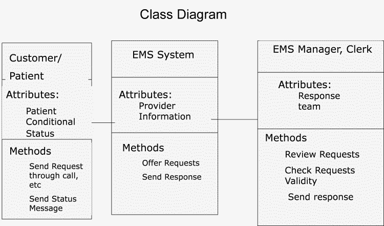 – Class Diagram: Shows the key objects in the system and their properties (attributes and methods)
