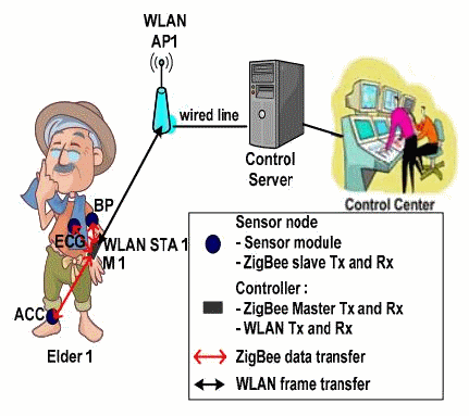 When sensors detect a life-threatening sign, for example the ECG signal reaches a critical threshold, the controller shall recognize the danger, and transmits a warning message piggybacked onto the ECG data to the control center. An emergency team can be immediately dispatched to assist the elderly person in distress. Other WLAN traffics due to email or internet activities also exist in a health monitoring environment.