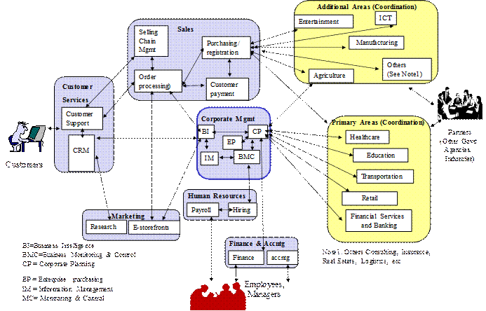 Figure 2 shows a more detailed business pattern of the general corporation -- it shows the services (business processes - BPs) in each functional area. For example, it shows four business processes of sales and 5 of corporate management. In addition, it also shows what BPs are conducted in each department and the interactions between various BPs. This detailed business pattern can be further expanded and customized to represent a very large number of corporations around the globe. Figure3 shows a sample corporate portal that can be used to support typical corporations.